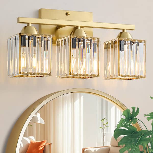 16.9 in. 3 Light Gold Vanity Light with Crystal Shade, Modern Luxury Bathroom Vanity Light