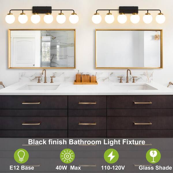 45.28 in. 6-Light Black and Gold Bathroom Vanity Light with Opal Glass Shades, Bulbs Not Included