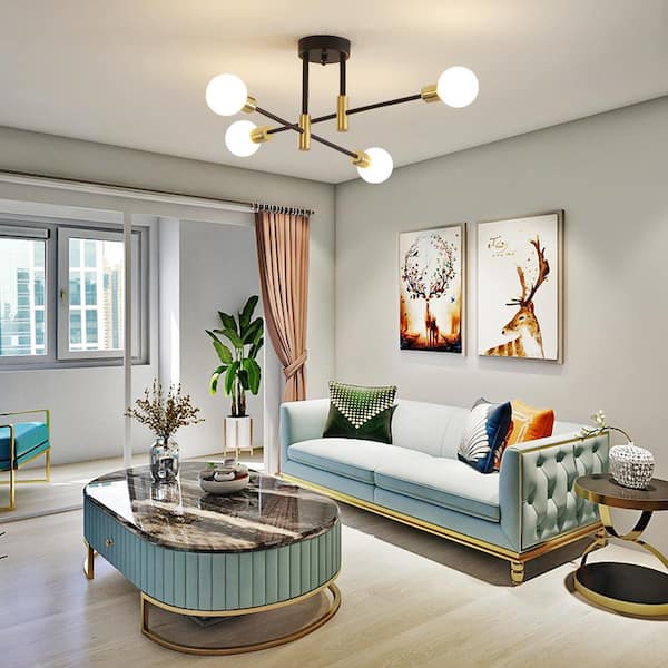 7 in. 4-Light Vintage Black and Gold Linear Sputnik Chandelier Semi Flush Mount, Bulb not Included