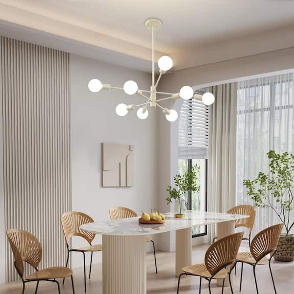 8-Light Vintage White Rubbed Gold Linear Sputnik Chandelier, Mid Century Ceiling Lights without Glass Shade and Bulb