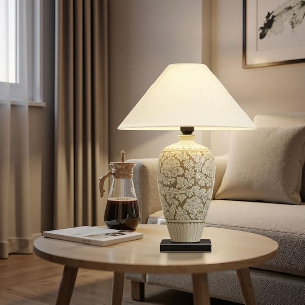 Art Deco 23.2 in. beige Ceramic Modern Table Lamp with Natural Linen Shade