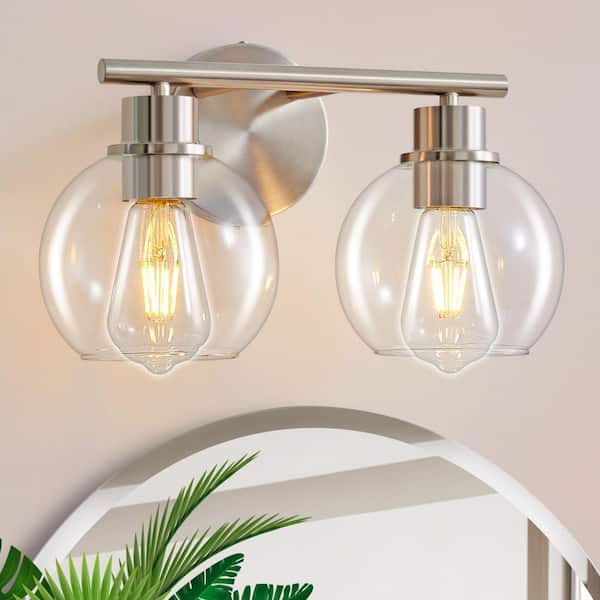 Modern 13.4 in. 2-Light Nickel Bathroom Vanity Light Interior Powder Room LED Lighting with Clear Globe Shades
