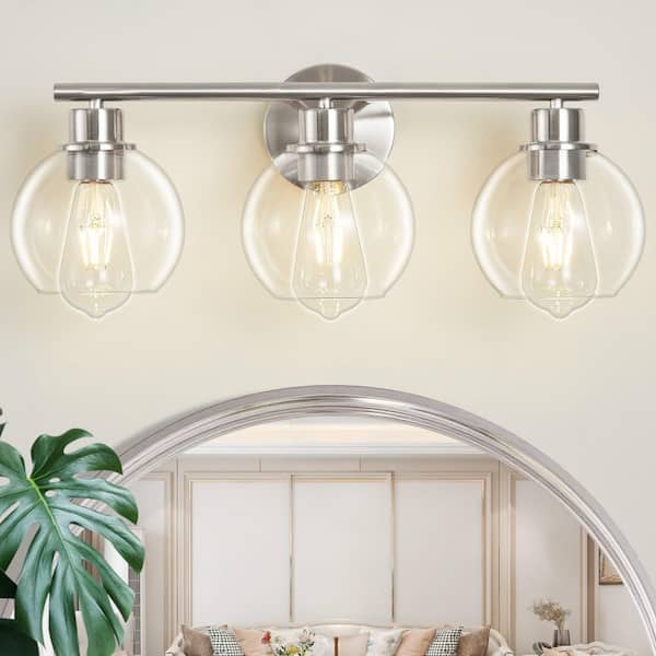 Modern 21.65 in. 3-Light Nickel Bathroom Vanity Light Interior Powder Room LED Lighting with Clear Globe Shades