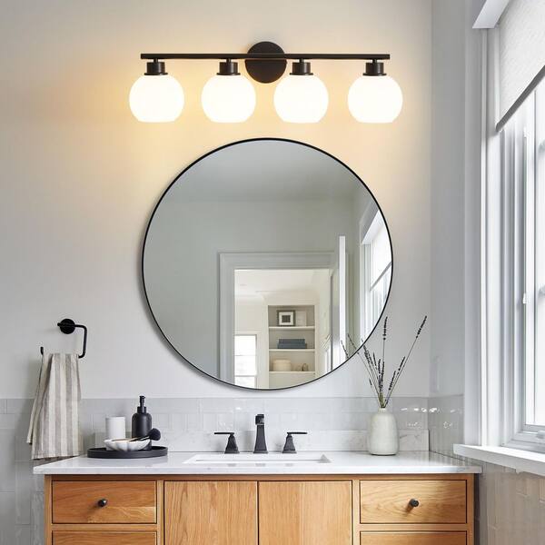 Modern 29.53 in. 4-Light Black Bathroom Vanity Light Interior Powder Room LED Lighting with Opal Glass Globe Shades