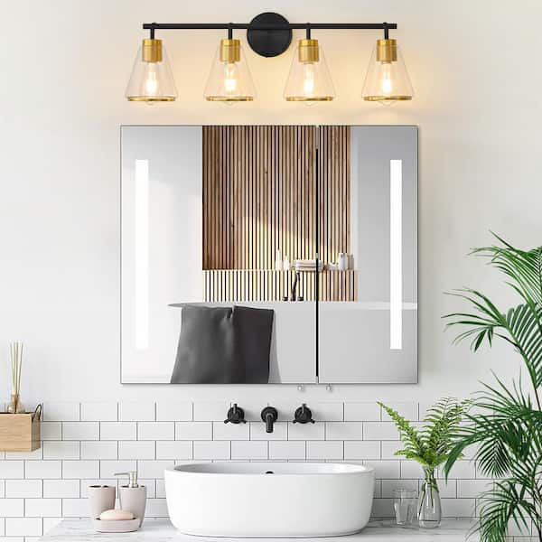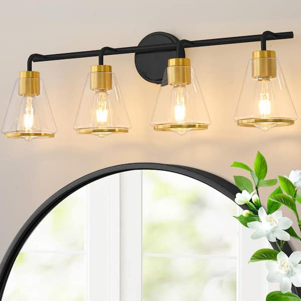 Modern 30.31 in. 4 Light Gold Vanity Light with Glass Shade with Metal Ring, Dimmable Sconces Wall Lighting for Bathroom