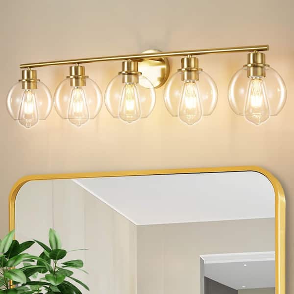 Modern 37.4 in. 5-Light Gold Bathroom Vanity Light Interior Powder Room LED Lighting with Clear Globe Shades