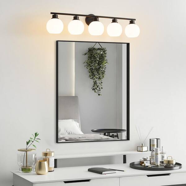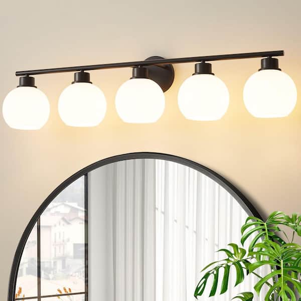 Modern 38.98 in. 5-Light Black Bathroom Vanity Light Interior Powder Room LED Lighting with Opal Glass Globe Shades