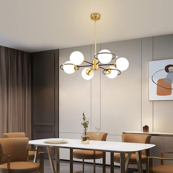 Modern 6-Light Black Ang Gold Sputnik Chandeliers with Milk White Glass Shade and Height Adjustable, Bulbs Not Included