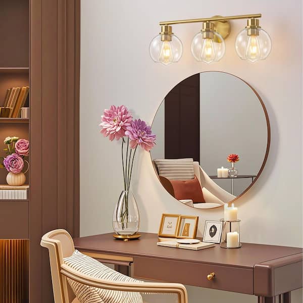Modern 9.06 in. 3-Light Gold Bathroom Vanity Light Interior Powder Room LED Lighting with Clear Globe Shades