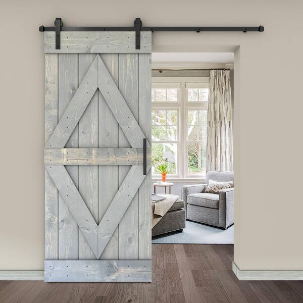 Diamond Series 24 in. x 84 in. Fully Set Up Weather Grey Finished Pine Wood Sliding Barn Door with Hardware Kit