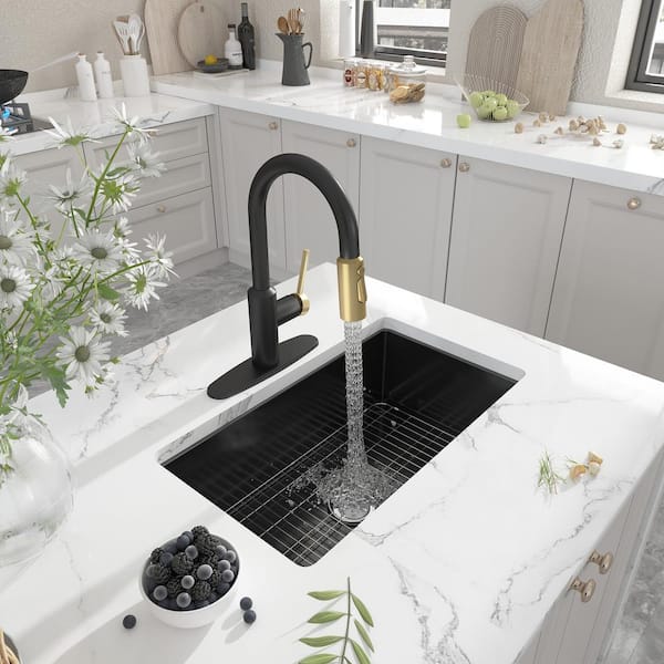 1.8 GPM 3-Spray Patterns Single Handle Pull Down Sprayer Kitchen Faucet with Deckplate in Matte Black & Brushed Gold