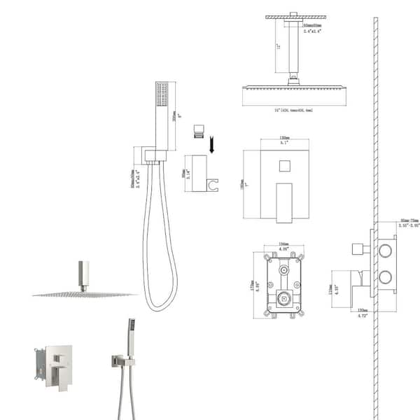 2-Spray Patterns Dual Ceiling Mount 360° Swivel 16 in. Fixed Handheld Shower Head 1.8 GPM in Brushed Nickel