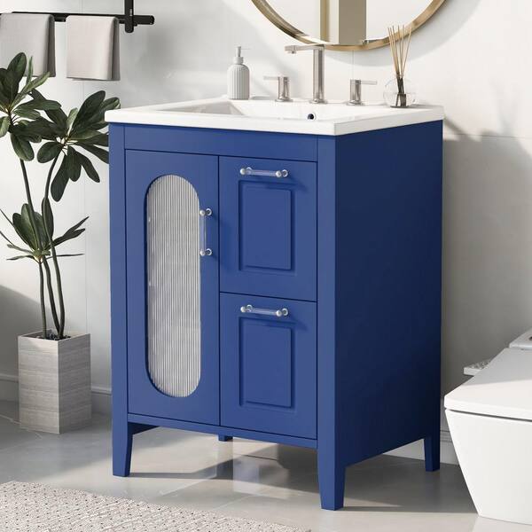 24 in. Single Sink Freestanding Blue Bath Vanity with White Ceramic Top Unassembled