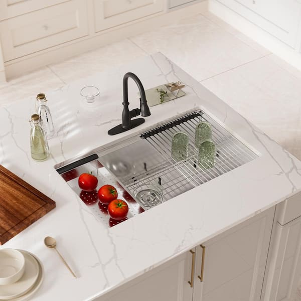 32 in. Undermount Single Bowl Brushed Stainless Steel Kitchen Sink with Cutting Board, Rolling Drying Rack and Colander
