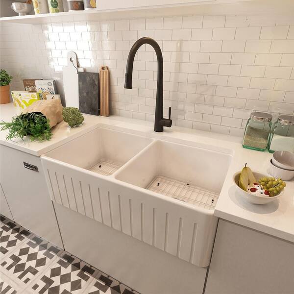 33 in. Farmhouse Apron Front Double Bowl White Fireclay Kitchen Sink with Striped Design and Draining Grid