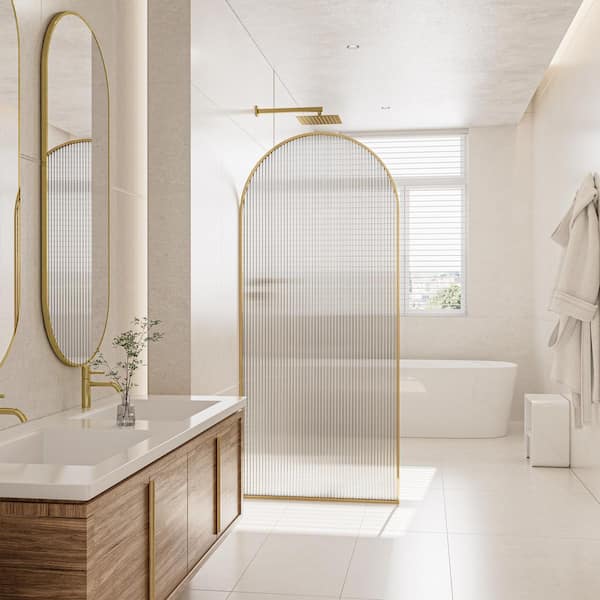 34 in.-34 in. W x 78 in. H Fixed Framed Curved Shower Door in Brushed Gold with Fluted Glass and Easy-Clean Coating