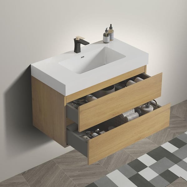 36 in. Single Sink Wall Mounted Natural Oak Bath Vanity with White Solid Surface Top Unassembled