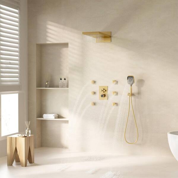 4-Spray 22 in. Rectangular Wall Mounted Dual Shower Head and Handheld Shower Head 2.5 GPM in Brushed Gold