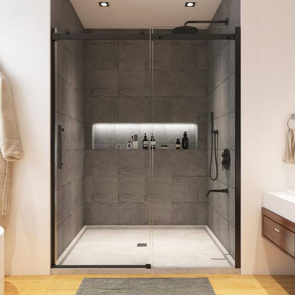 48 in W x 76 in H Single Sliding Frameless Clear Glass Shower Door in Matte black