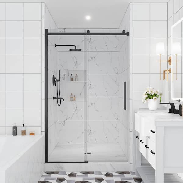 48 in. W x 76 in. H Sliding Frameless Shower Door with 5/16 in. (8 mm) Clear Glass in Matte black