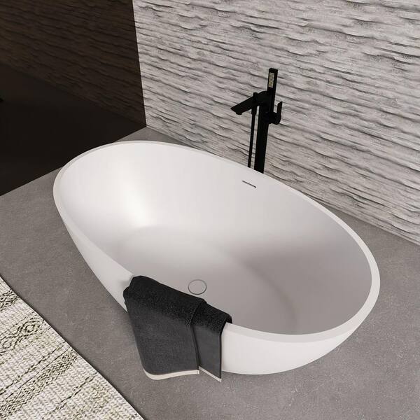 55 in. x 30.7 in. Solid Surface Oval Freestanding Soaking Bathtub with Center Drain Bathtub Strip in Glossy White