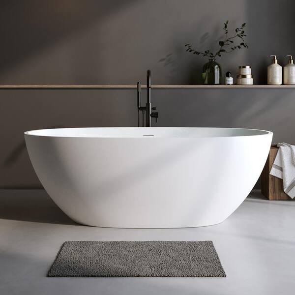 59 in. Soaking Flatbottom Solid Surface Stone Resin Freestanding Thick Edge Bathtub With Pop-up Drain in Matte White