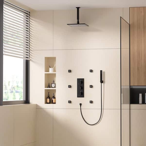 6-Spray 12 in. LED Thermostatic Dual Shower Head Ceiling Mount Fixed and Handheld Shower Head 2.5 GPM in Matte Black