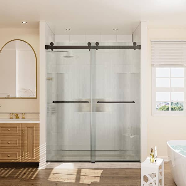 60 in. W x 76 in. H Double Sliding Frameless Shower Door in Matte Black with Easy-Clean Clear Tempered Ribbed Glass