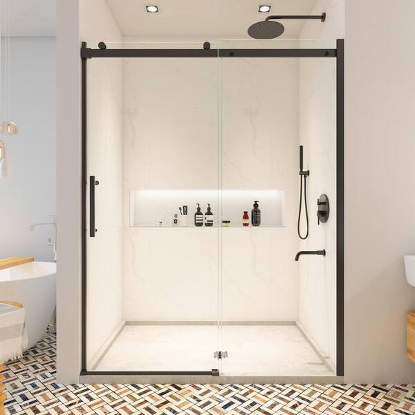 60 in W x 76 in H Single Sliding Frameless Clear Glass Shower Door in Matte black