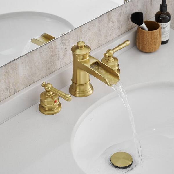 Classic 8 in. Widespread Double Handle Brass Bathroom Faucet with Pop Up Drain and Water Supply Hoses in Brushed Gold