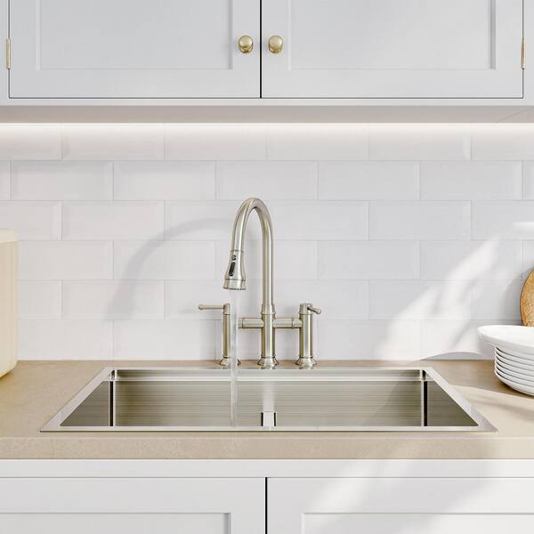 Double Handle Bridge Pull-Down Kitchen Faucet with 3-Function Spray head in Brushed Nickel