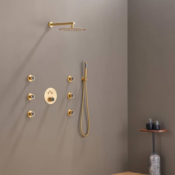 Single Handle 1-Spray 3-function Thermostatic Dual Shower Faucet 1.8 GPM with 6 Body Spray Jets in Brushed Gold