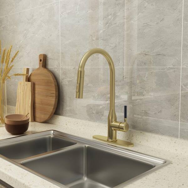 Single Handle Pull Down Sprayer Kitchen Faucet with Advanced Spray Pull Out Spray Wand and Deckplate in Brushed Gold