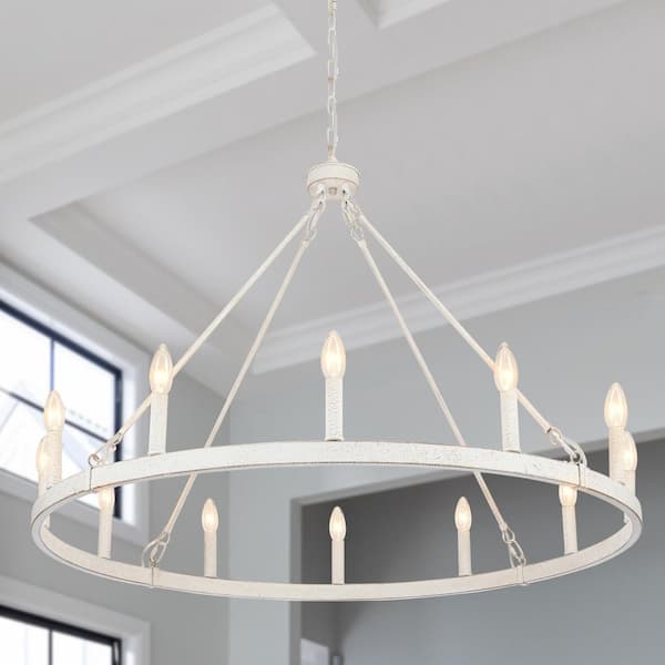 Dineen 12-Light 38 in. W Distressed White Candle Style Wagon Wheel Farmhouse Chandelier for Bedroom Foyer Stairway