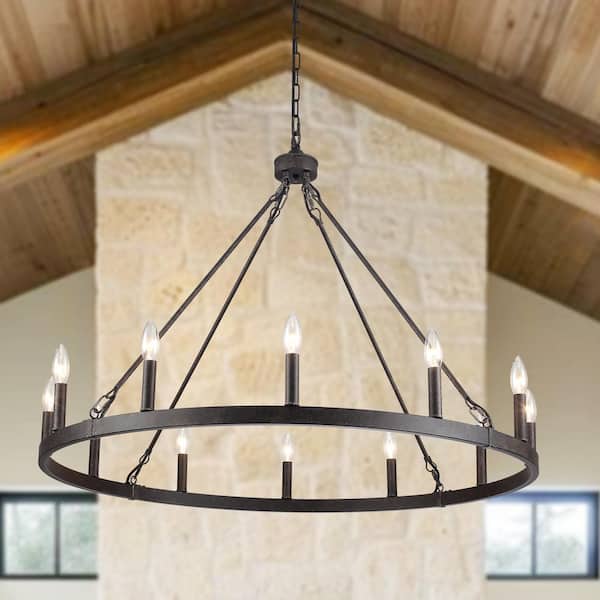 Dineen 12-Light Antique Distressed Brown Candle Style Wagon Wheel Chandelier Vintage Rustic Adjustable Hanging Light