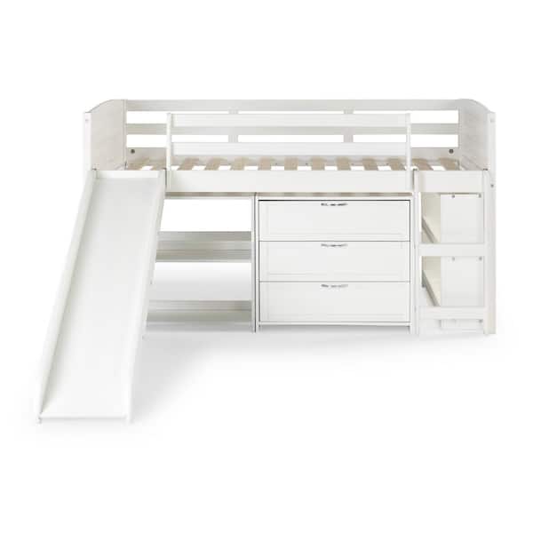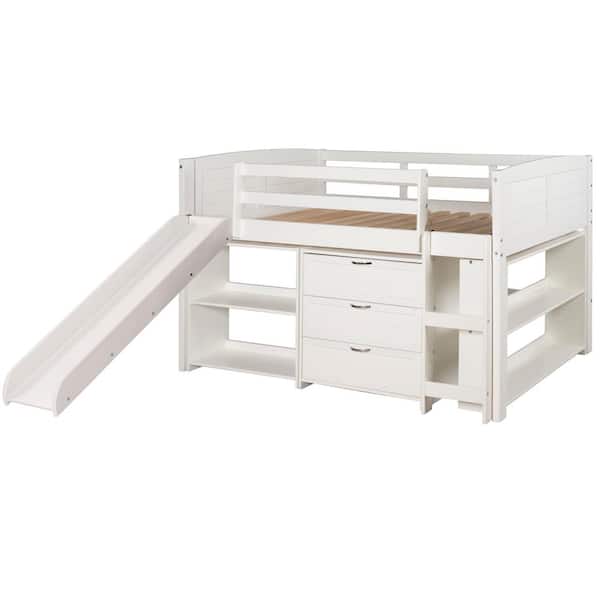 White Twin Louver Low Loft Bed with Slide with 3-Drawers and 2-Bookshelves
