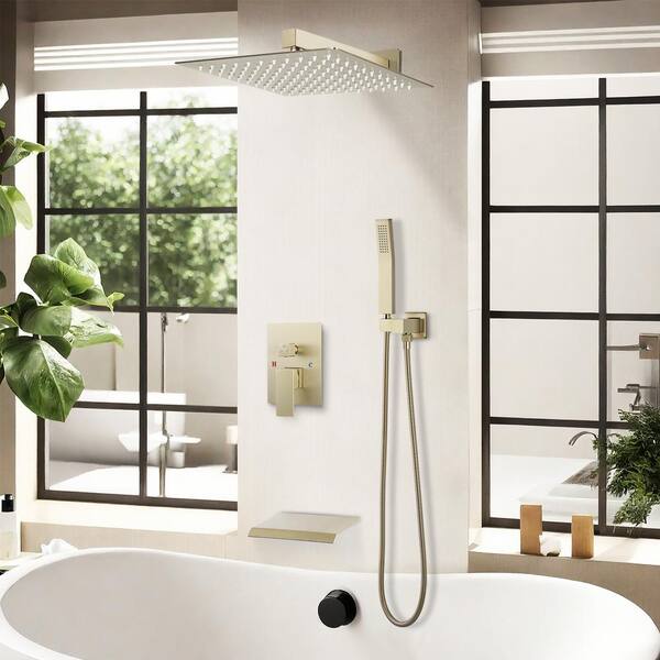 Double Handle 3-Spray Tub and Shower Faucet Shower Combo 12 in. Shower Head 2.5 GPM in Brushed Gold Valve Included