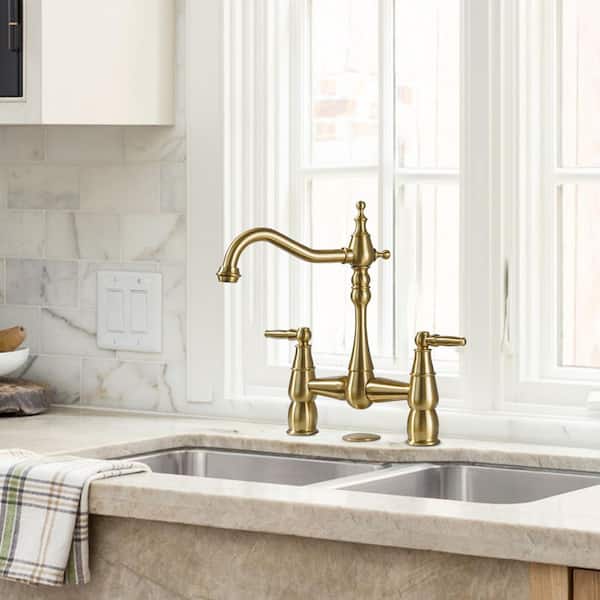 Double-Handle Bridge Kitchen Faucet Deck-Mount with Sink Hole Cover in Brushed Gold