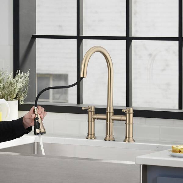Double Handle Bridge Kitchen Faucet with Pull-Down Spray Head, Stainless Steel, 360° Swivel in Gold