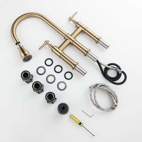 Double-Handle Bridge Kitchen Faucet with Pull Down Sprayer 304 Stainless Steel Kitchen Sink Faucet in Brushed Gold