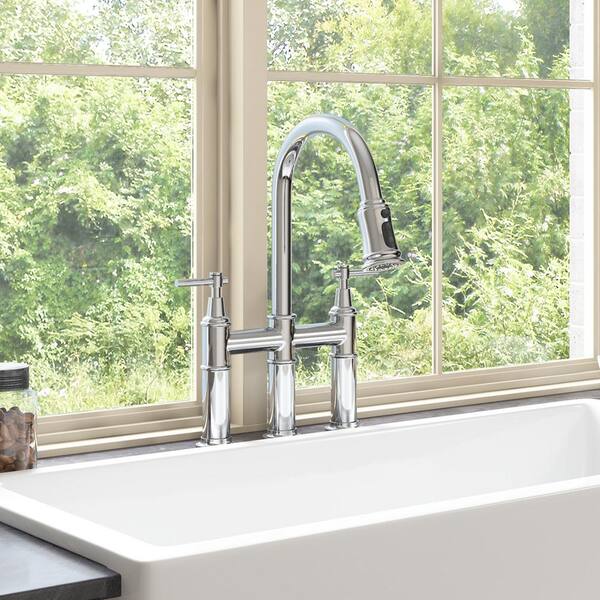 Double Handle Bridge Kitchen Faucet with Pull Down Sprayer Brass 8 in. 3 Holes Kitchen Sink Faucets in Polished Chrome
