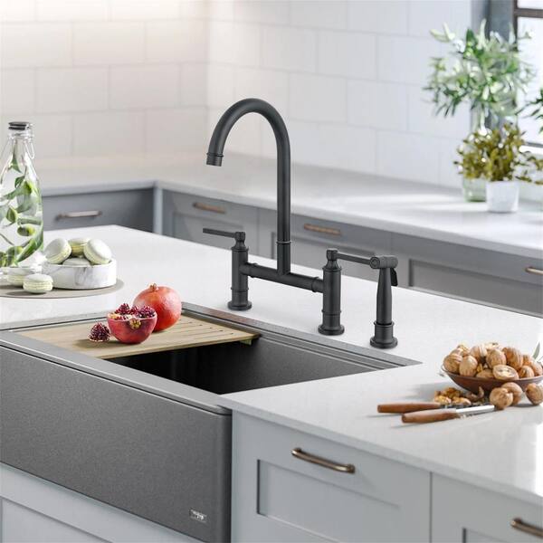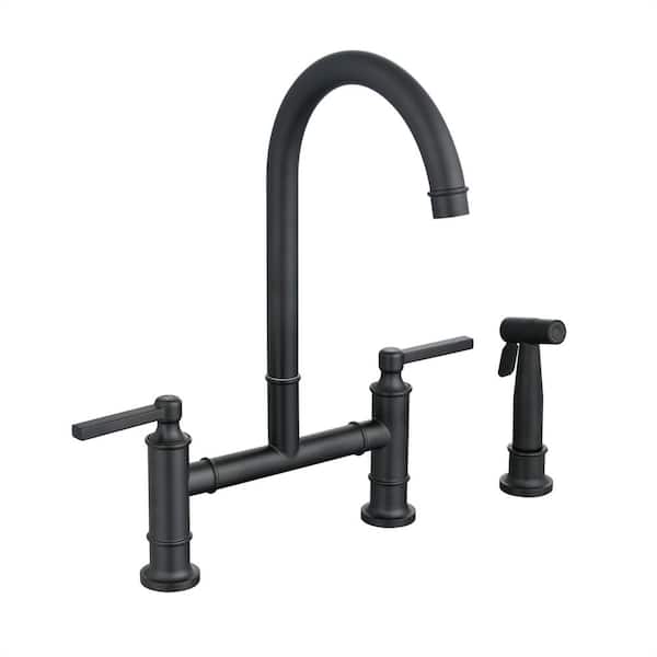 Double Handle Bridge Kitchen Faucet with Side Sprayer Commercial 304 Stainless Steel Kitchen Sink Faucets in Matte Black