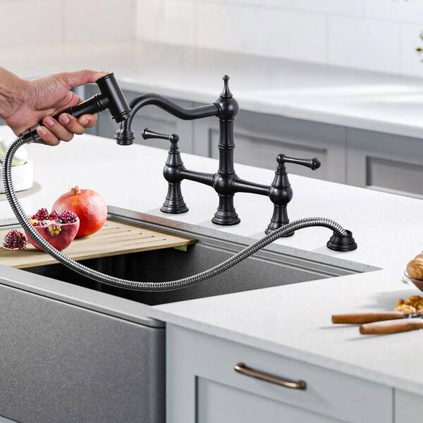Double-Handle Bridge Kitchen Faucet with Side Sprayer in Oil Rubbed Bronze