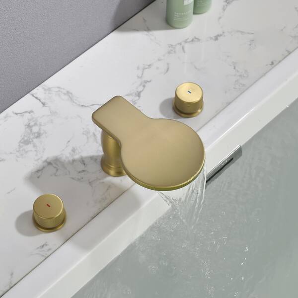 Double Handle Deck-Mount Waterfall Roman Tub Faucet with Circular Arc Design Faucet in Brushed Gold