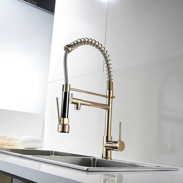 Double Handles Deck Mount Pull Out Sprayer Kitchen Faucet Included in Brushed Gold