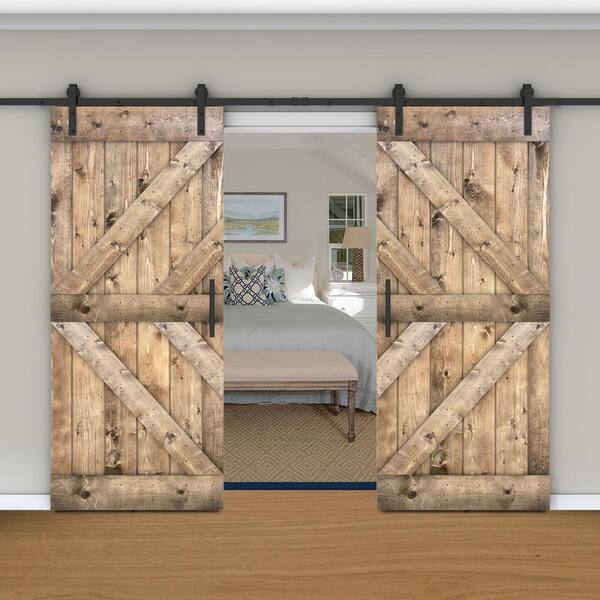 Double KL 60 in. x 84 in. Fully Set Up Dark Walnut Finished Pine Wood Sliding Barn Door with Hardware Kit
