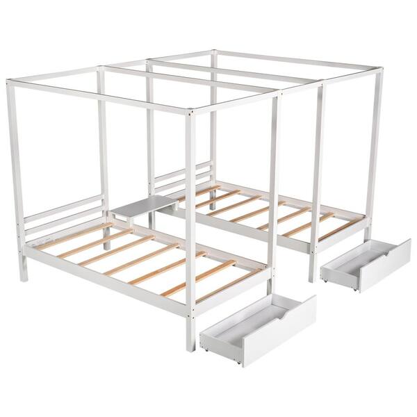 Double Shared Twin Size Canopy Platform Beds with Two Drawers and Built-in Desk