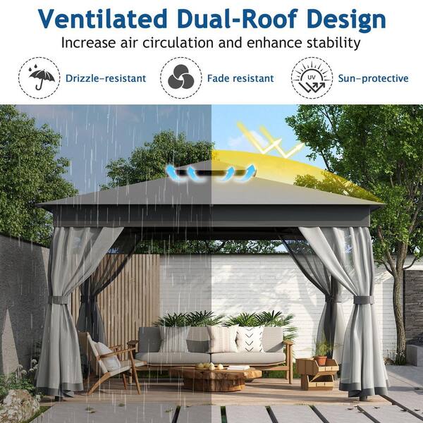 10 ft. x 12 ft. Grey Outdoor Gazebo Tent with Double Roofs Patio Gazebo with Mosquito Netting Patio Canopy