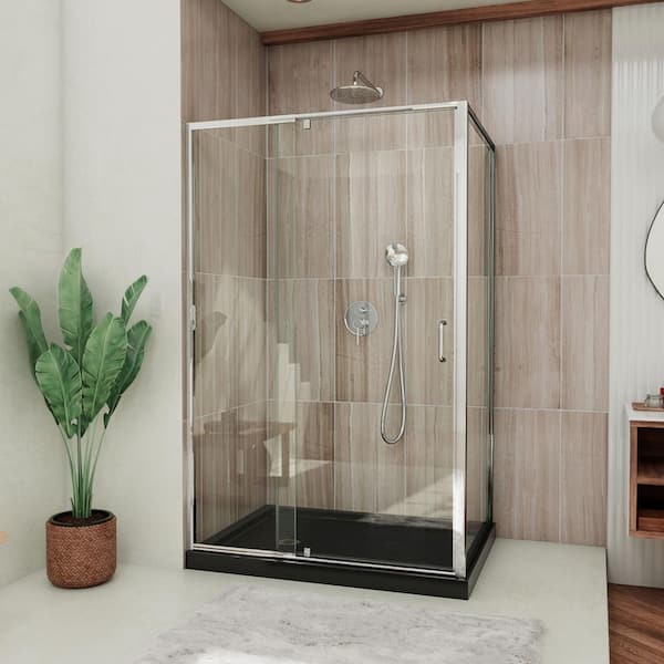 Flex 36 in. D x 48 in. W x 74.75 in. Framed Pivot Shower Enclosure in Chrome with Left Drain Black Acrylic Base Kit