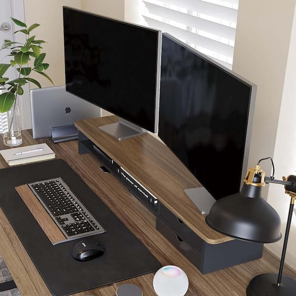 Dual Monitor Riser 42.5 Inch Computer Stand with Drawer 2 Tier Wood Acrylic Desktop Organizer for Laptop TV Screen